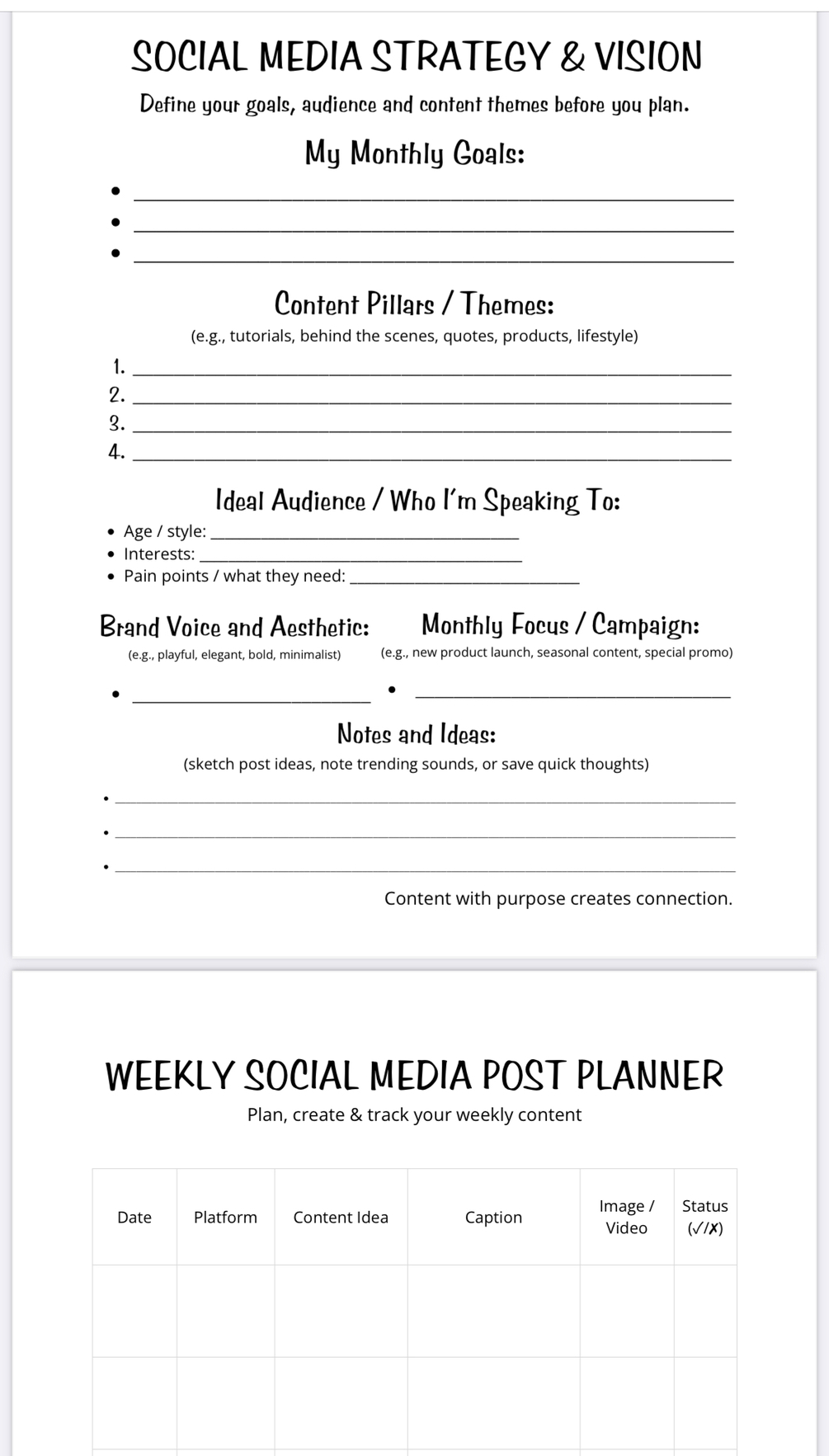 Weekly Social Media Post Planner – plan posts by date, platform, captions & hashtags Monthly Content Calendar – see your month at a glance Hashtag Library – keep your top, niche & branded hashtags organized by platform Notes & Reflections page – capture what worked & new ideas